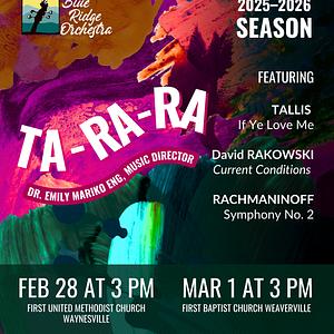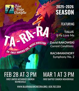 Info: https://blueridgeorchestra.org/ta-ra-ra-feb-mar-2026, Facebook, Instagram, or call 828-782-3354.