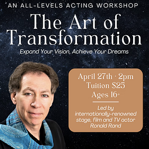Step into a journey of creativity, self-discovery, and transformation in this dynamic 90-minute workshop. Through a blend of improvisation, poetry, song, and energizing movement exercises, you'll explore the art of acting and uncover the joy of creative expression. Come dressed in comfortable clothing and bring a monologue or a favorite poem to share. Led by renowned acting teacher and performer Rand, this workshop introduces powerful techniques from Stanislavsky’s original “Method of Physical Actions” acting chart—each participant will receive their own copy. Drawing from the teachings of legendary mentors Stella Adler and Jerzy Grotowski, Rand’s exercises guide you to connect deeply with your creative spirit.