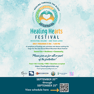 The Healing HeArts Festival is meant to bring community members together and support them in their individual and collective journeys of recovery from Helene. This support is provided in tangible ways by offering: Healing arts presentations, panel discussions, and hands-on services to community members. A variety of food, music, arts ,and crafts managed by an outstanding team of volunteers.