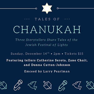 Join us as three storytellers share tales of Chanukah - the Festival of Lights. These varied stories will warm your hearts and uplift your spirits regardless of your religious background. Tales of Chanukah will celebrate this season of love and light. Featured tellers are Catherine Serota, Zane Chait, and Donna Catton-Johnson. Larry Pearlman will emcee the event.