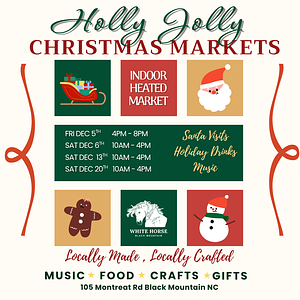 The holiday season in Black Mountain shines a little brighter each year, and the 3rd Annual Holly Jolly Holiday Market Series at White Horse Black Mountain is one of the highlights of the season. Shoppers are invited to browse handcrafted treasures, seasonal treats, and one-of-a-kind gifts while enjoying live, local music in the warm and welcoming atmosphere of the historic White Horse venue.