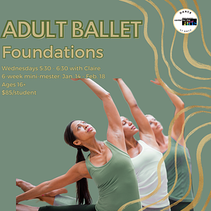 Discover the beauty and strength of ballet this winter in Adult Ballet: Foundations—perfect for beginners or anyone looking to explore dance in a welcoming, low-pressure environment. This class focuses on basic posture, port de bras, turnout, alignment, and simple combinations, helping you build a strong foundation to move forward in your dance journey. Along the way, you’ll improve core strength, stability, posture, and bone health, all while enjoying a low-impact, mindful workout that nurtures your body, mind, and brain. No prior dance experience is needed—just bring curiosity, energy, and a willingness to move. Step into ballet this winter and enjoy the confidence, focus, and vitality it can bring to your everyday life.