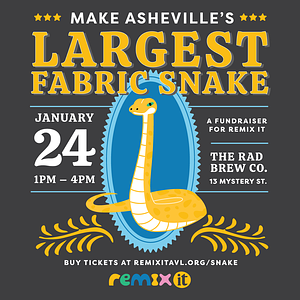 ReMix It, Asheville's future creative reuse center is inviting the community to help create Asheville’s largest fabric snake! Each ticket includes a 10x10 fabric square that participants will personalize at the event and return to be sewn live into one giant community art piece. The finished piece will first be displayed at the ArtsvilleUSA gallery space at the Ferguson Family YMCA in celebration of Earth Day before moving to its permanent home hanging from the rafters in ReMix It’s future storefront. All proceeds support the launch of Asheville’s first nonprofit creative reuse center. Tickets start at $10.