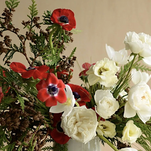 Craft a festive evergreen-and-bloom centerpiece in this holiday floral class! Charcuterie included, with drinks available ~